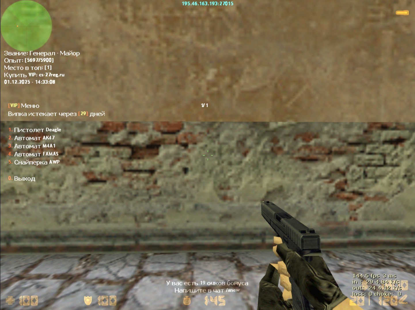Что для этого нужно, заходим на сервер 195.46.163.193:27015, нажимаете английскую букву N и выбираете первый пункт "Взять ВИП тест", либо командой через чат в игре /viptest